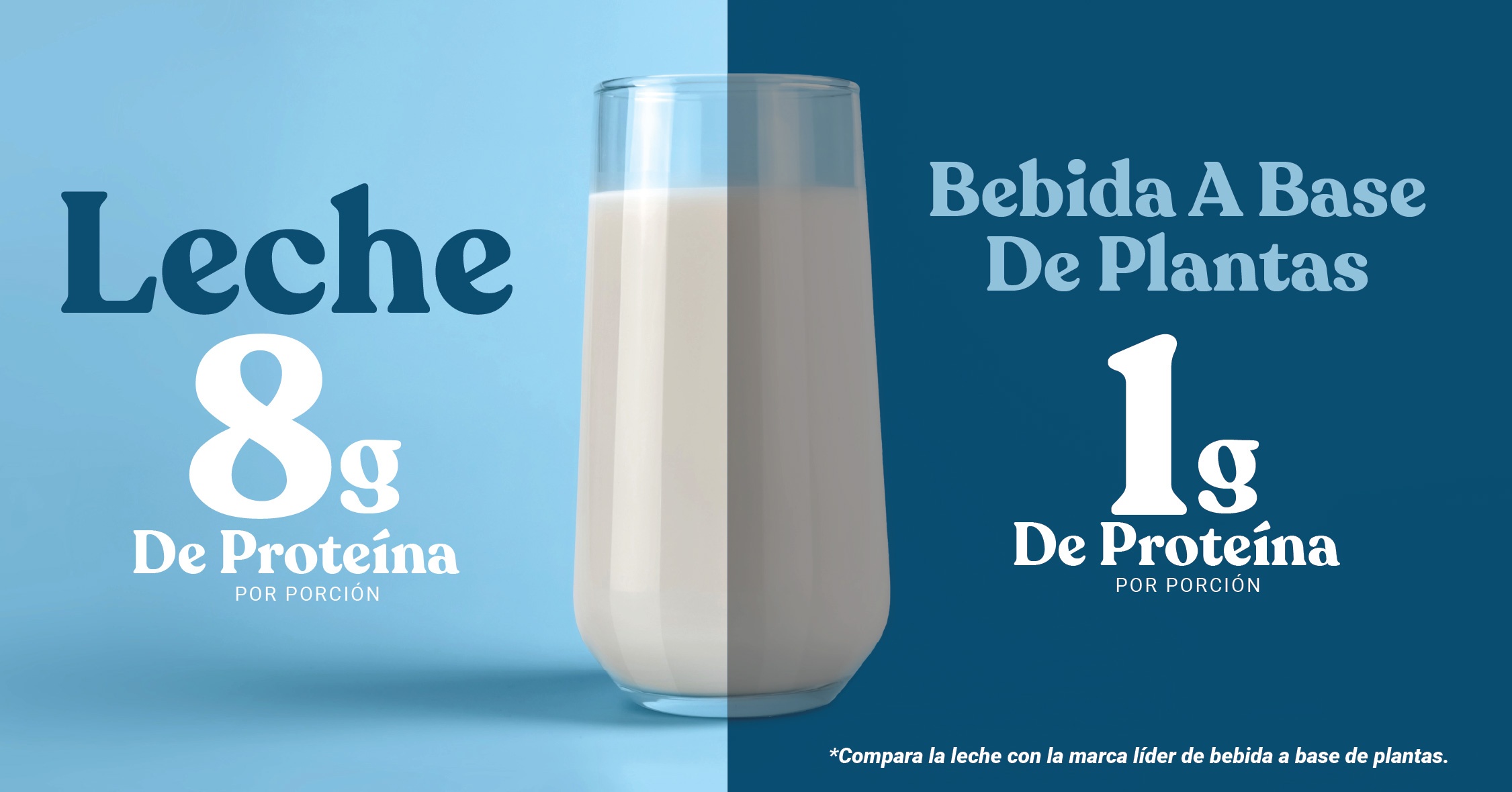 No toda la proteína es igual. La leche aporta de forma natural proteína completa y de alta calidad con los nueve aminoácidos esenciales que tu cuerpo necesita para construir músculo, apoyar la recuperación y mantenerse con energía. La leche tiene 8 veces más proteína por porción que bebida líder a base de plantas.