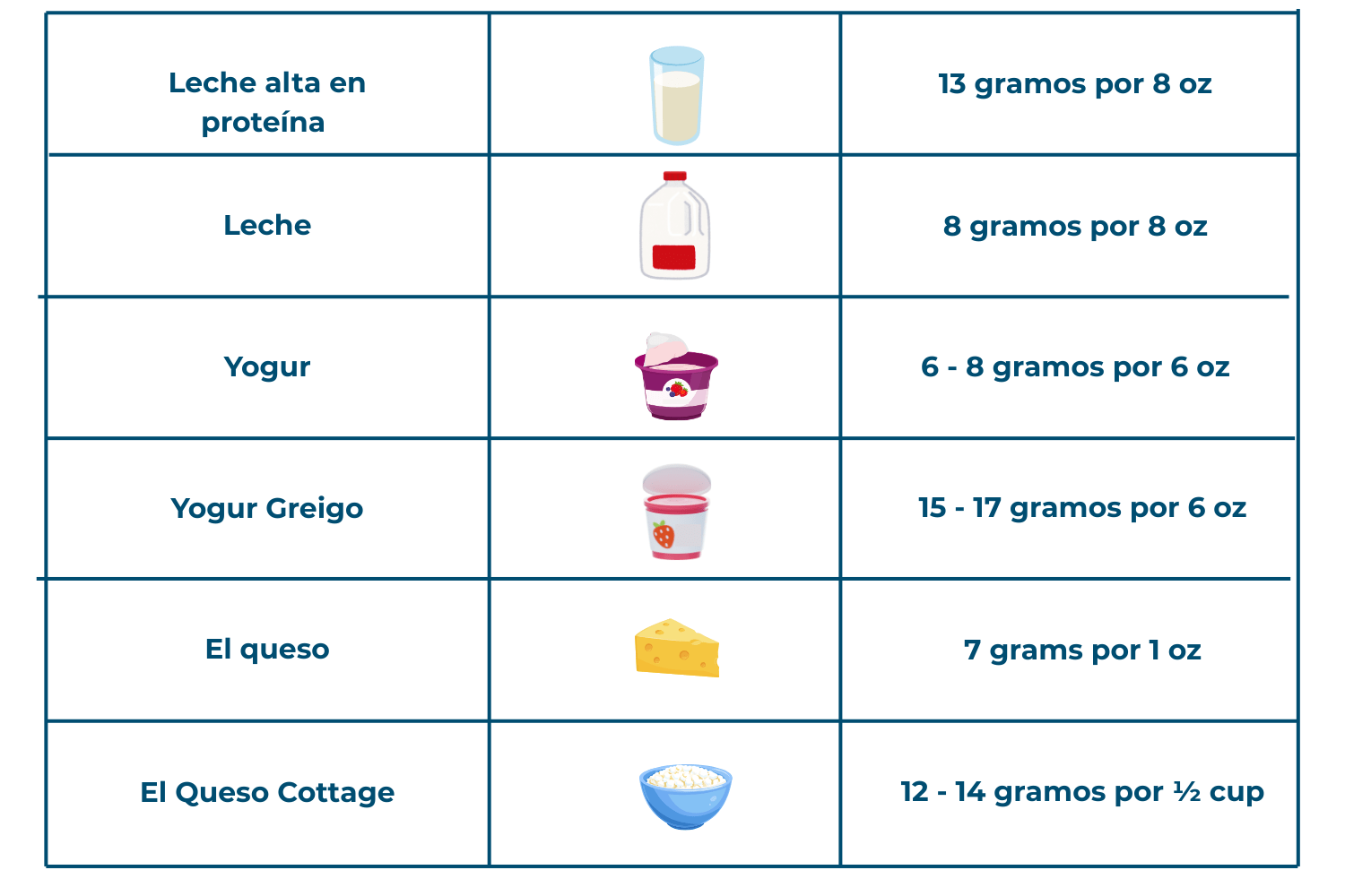 Aquí tienes un vistazo rápido a la cantidad de proteína que encontrarás en algunos alimentos lácteos comunes: